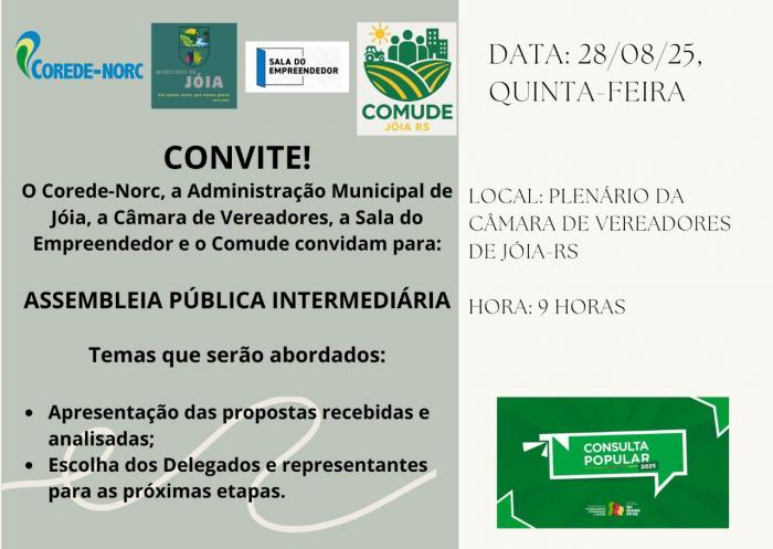 A Assembleia Pública Intermediária será realizada pelo Corede e Administração Municipal