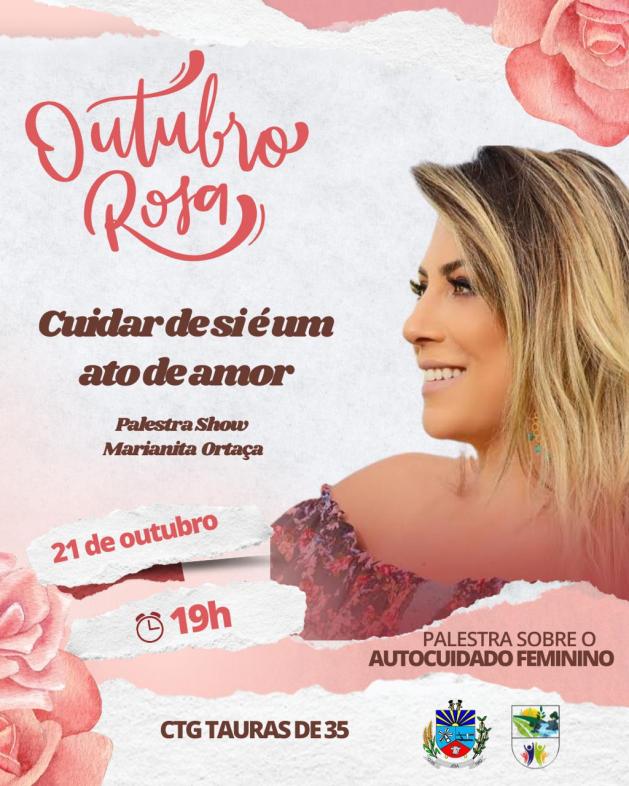 Nesta terça-feira, dia 21, a partir das 19 horas no CTG Tauras de 35, haverá palestra show com Marianita Ortaça. Ela vai falar sobre o autocuidado feminino, com ênfase ao tema, “Cuidar de si é um ato de amor”.