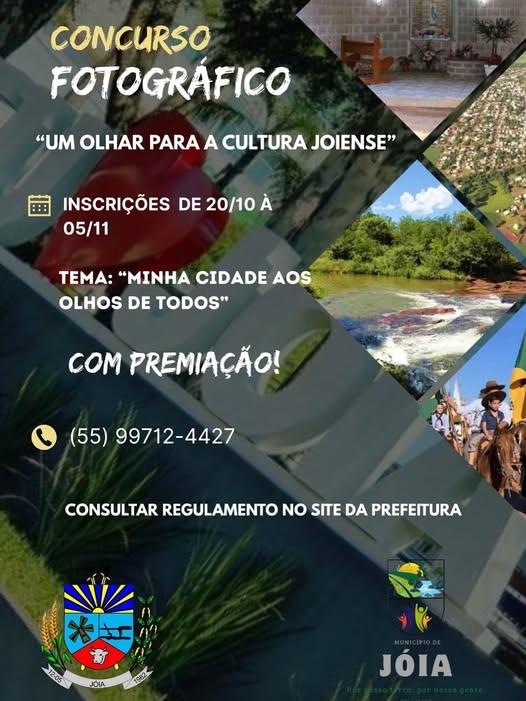 A Prefeitura de Jóia está promovendo o Concurso Fotográfico “Um olhar para a cultura joiense”, uma oportunidade para os amantes da fotografia registrarem a beleza, a cultura e as paisagens do município.