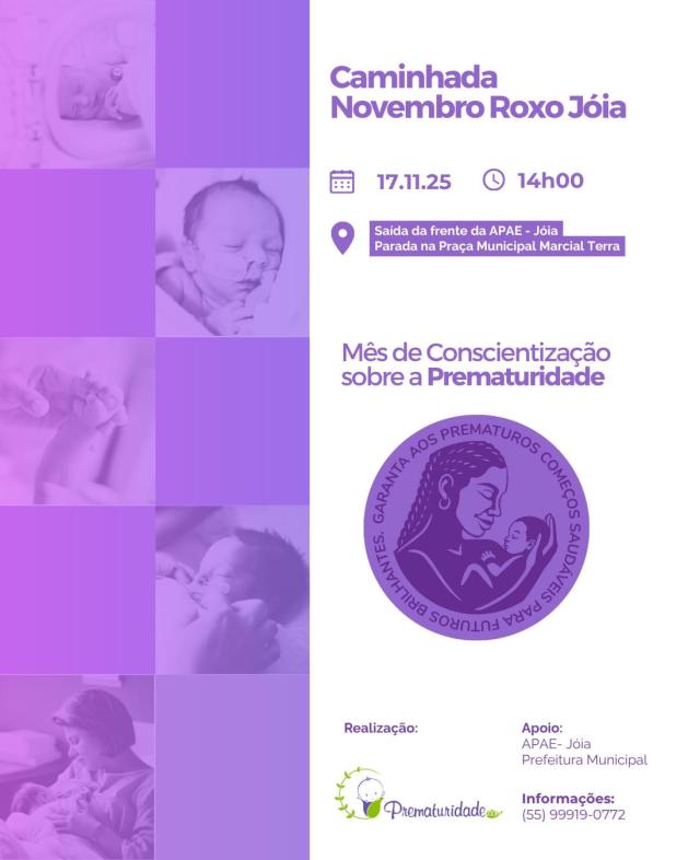 Caminhada Novembro Roxo mobiliza comunidade de Jóia pela conscientização sobre a prematuridade