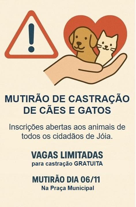 O mutirão acontece nesta quinta-feira, 6 de novembro, na Praça Municipal, a partir das 7h30min. Os animais serão atendidos por ordem de chegada.