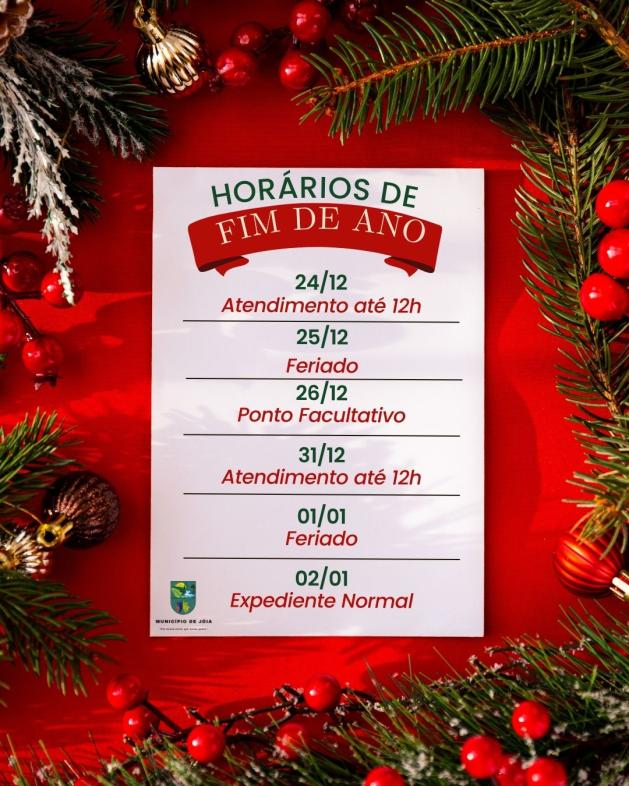 A Prefeitura Municipal de Jóia divulgou os horários especiais de funcionamento dos órgãos da administração municipal durante o período de final de ano. A medida visa organizar o atendimento à população em razão das datas comemorativas de Natal e Ano-Novo.